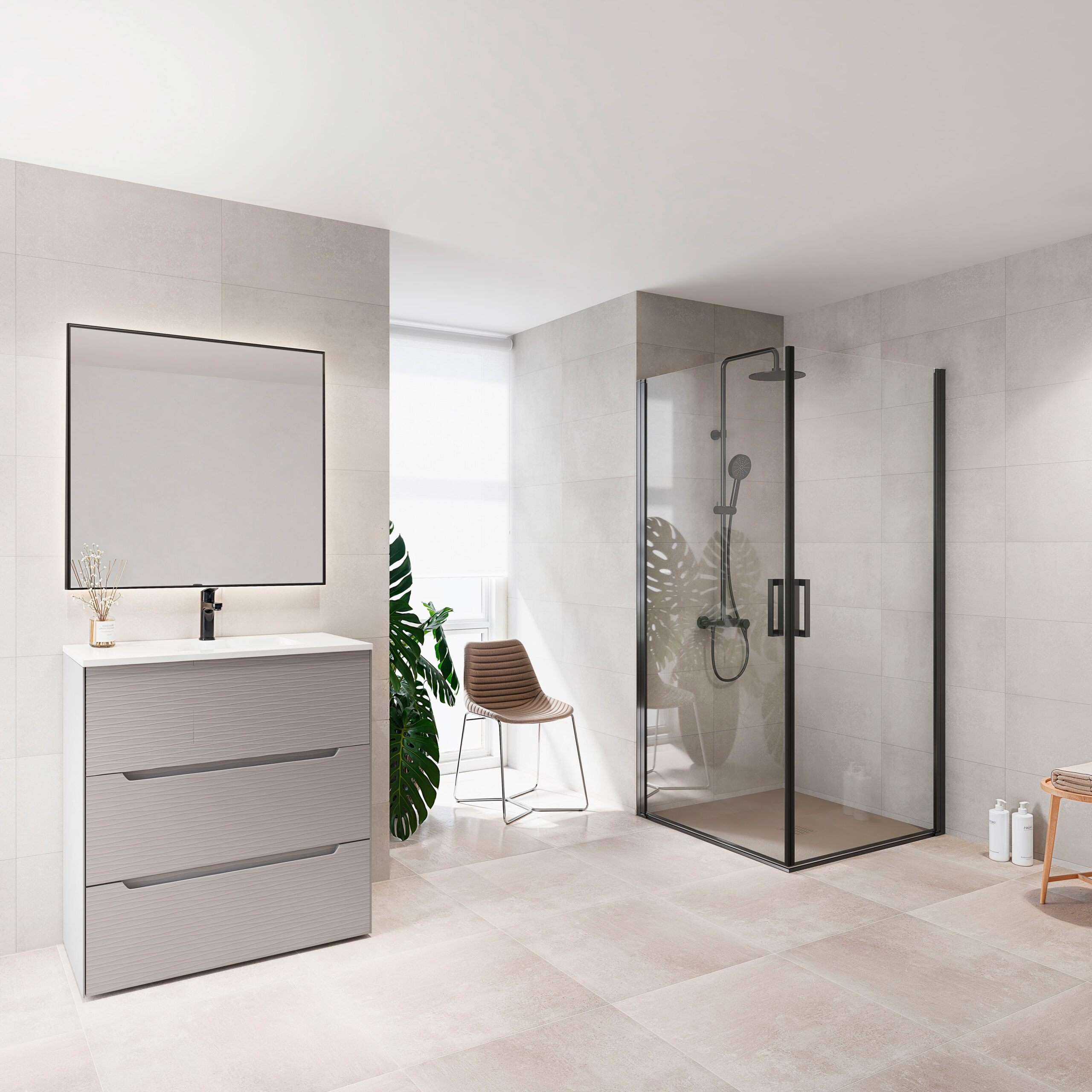 Mampara angular abatible de dos hojas abatibles de 180º de apertura. Perfiles de aluminio con soporte de fijación de acero. Acabados plata brillo y negro mate en stock y disponible bajo pedido en acabados Inox cepillado y blanco mate que permiten la total combinación con los acabados de grifería. Cuenta con tratamiento easy clean.