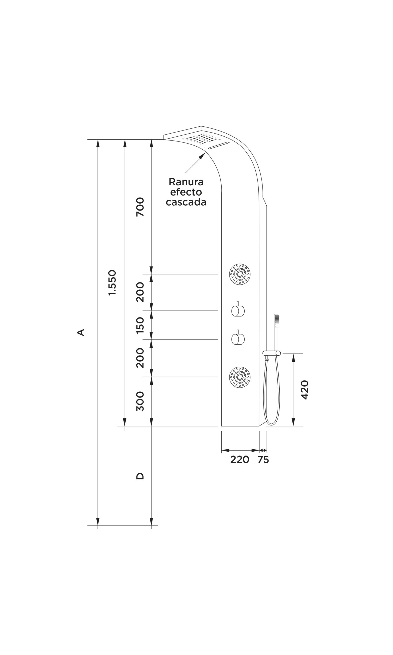 Columna de ducha termostática con efecto cascada, cuyos beneficios incluyen la relajación muscular y la mejora de la circulación al aplicar presión en diferentes áreas del cuerpo.