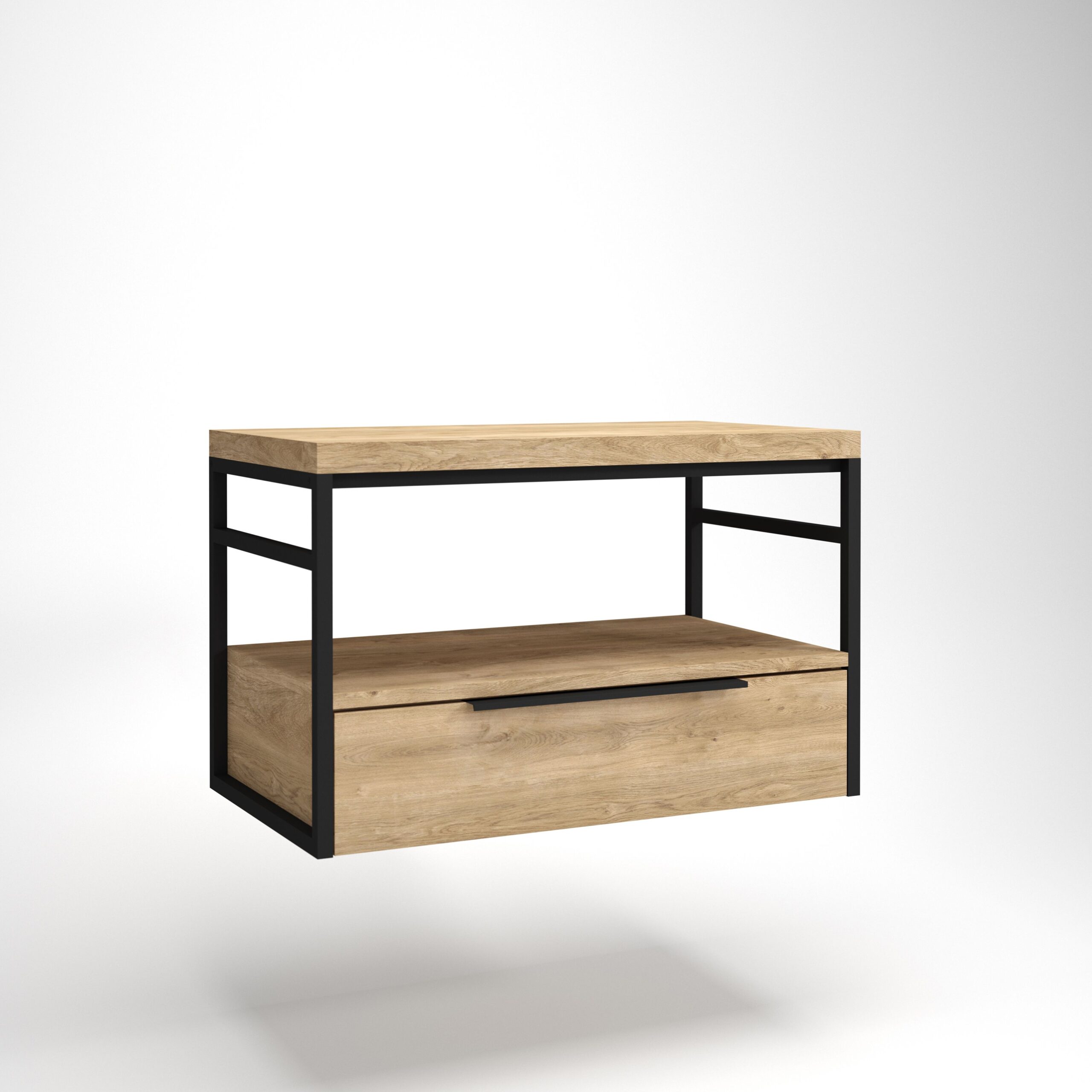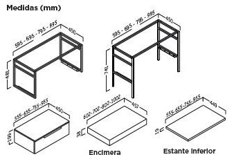 Mueble de estética industrial conformado por una elegante estructura metálica. Admite diferentes opciones de encimera/lavabos y zona de almacenaje inferior que puedes complementar con estante o cajón metálico de extracción total.